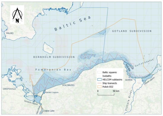 Figure 1. The study area—Polish Exclusive Economic Zone in the southern part of the Baltic Sea, divided into the HELCOM subdivisions (Bornholm and Gotland) and Baltic Squares (20 × 20 km). Red lines are the transects used for ship-based monitoring of waterbirds offshore.