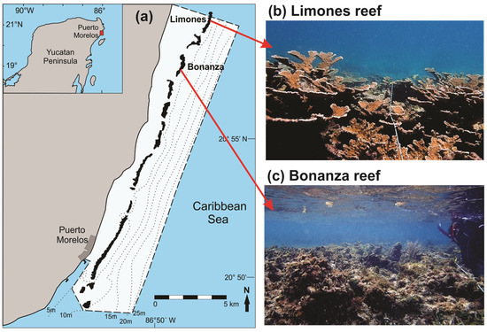 The Puerto Morelos Reef National Park (PMRNP; Figure 1) is a marine protected area located on the northern coast of the state of Quintana Roo, Mexico, in the Mexican Caribbean. The PMRNP includes a series of reefs that differ in size and structural complexity [7,40], separated from the coast by a shallow (≤5 m) reef lagoon. Two of these reefs, called “Limones” (centered at 20°59.1′ N, 86°47.9′ W) and “Bonanza” (centered at 20°57.6′ N, 86°48.9′ W), are similar in size (~1.5 km in length) but exhibit highly contrasting levels of habitat degradation despite being separated from each other by a distance of ~2 km (Figure 1). Up to 2015, Limones sustained healthy and resilient populations of Acropora palmata, with cover values of up to 50% along its central part [7,41]. In contrast, the average live coral cover on Bonanza was ~7%, with extensive areas of relic Acropora skeletons and a predominance of erect macroalgae (>60% cover) [7]. Fishing activities have been banned on both Limones and Bonanza since 1996. However, Bonanza is open to visitation, whereas tourist activities are not permitted on Limones, given the high ecological value of this reef [41].