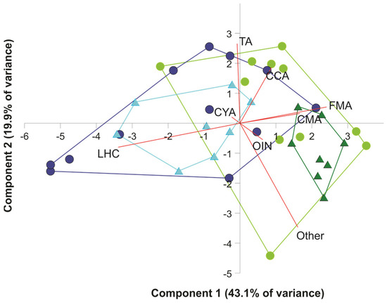 Principal Components Analysis (PCA) bi-plot on logit-transformation of percent cover of benthic components over the two studied reefs in 2015 and 2020. Each symbol represents a transect, and the lines are the convex hulls. Dark blue dots and lines: Limones 2015; aqua triangles and lines: Limones 2020; light green dots and lines: Bonanza 2015; dark green triangles and lines: Bonanza 2020. LHC, live hard coral; TA, turf algae; FMA, fleshy macroalgae; CMA, calcareous macroalgae; CCA, coralline algae; CYAN, cyanobacterial mats; OIN, other sessile invertebrates; Other, other components (sand, seagrass, hardbottom).