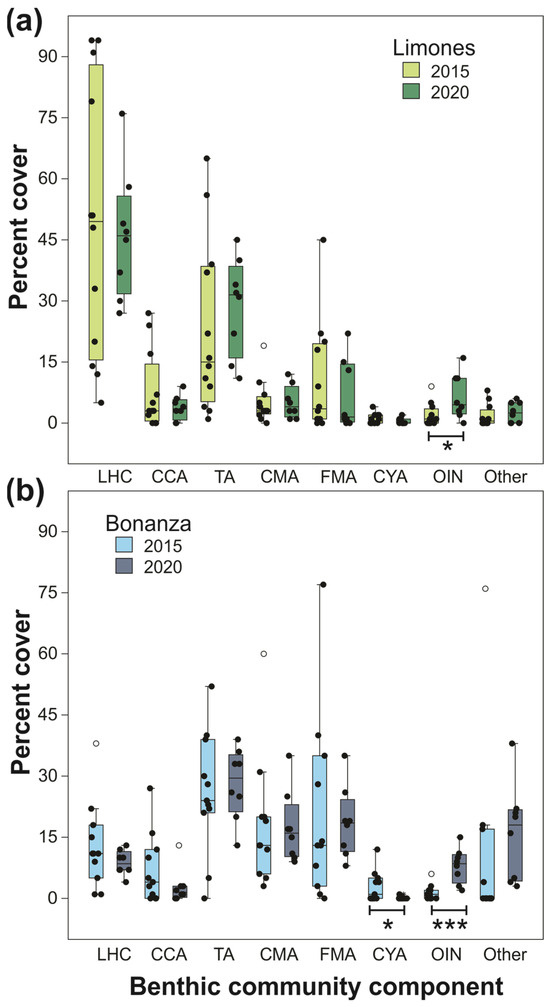 Box plots of percent cover of different components of the benthic community estimated in 2015 and 2022 on (a) Limones and (b) Bonanza. Within each reef, components whose percent cover differed between years are marked. * p < 0.05; *** p < 0.001. Central lines in boxplots correspond to medians; box extremities indicate interquartile range (IQR, first and third quartiles); whiskers include all data within 1.5 times the IQR; white dots outside the whiskers denote outliers. LHC, live hard coral; CCA, coralline algae; TA, turf algae; CMA, calcareous macroalgae; FMA, fleshy macroalgae; CYA, cyanobacterial mats; OIN, other sessile invertebrates; Other, other components (sand, seagrass, hard bottom).