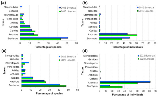 Macrocrustaceans on both reefs comprised decapods of infraorders Brachyura, Anomura, Caridea, Achelata, Axiidea, Gebiidea, and Stenopodidea, the Superfamily Penaeoidea, as well as stomatopods (Order Stomatopoda). The proportion of species and individuals within each of these taxa by reef and year are shown in Figure 4a–d. In both years, true crabs (Brachyura) made up the majority of species, followed by hermit and porcellanid crabs (Anomura) and caridean shrimps (Caridea) (Figure 4a,c). Spiny and slipper lobsters (Achelata), ghost and mud shrimps (Axiidea and Gebiidea), penaeid shrimps (Penaeoidea), banded shrimps (Stenopodidea), and stomatopods comprised relatively few species, especially in 2022 (Figure 4c), when the percentage of species of Anomura increased on both reefs relative to 2015 (Figure 4a). Regardless, the changes in proportions of species by higher taxon were not significant (3-D contingency table analysis, χ216= 10.418, p = 0.843). In terms of the number of individuals, Brachyura and Anomura were by far the most abundant taxa on both reefs. However, anomurans were significantly more abundant and brachyurans less abundant on Bonanza in 2022 (Figure 4d) than in 2015 (Figure 4c) (χ216 = 1750.82, p < 0.0001).