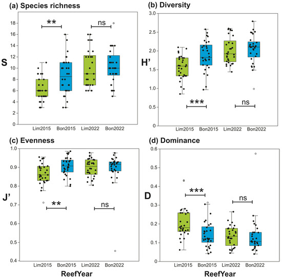 Box plots of ecological indices for macrocrustaceans by reef (Limones, green boxes; Bonanza, blue boxes) and year (2015 and 2022), with results of statistical comparison between reefs by year (** p < 0.01; *** p < 0.001, n.s. = not significant). (a) Species richness; (b) Shannon–Wiener’s diversity; (c) Pielou’s evenness; (d) Simpson’s dominance. Central lines in boxplots correspond to medians; box extremities indicate interquartile range (IQR, first and third quartiles); whiskers include all data within 1.5 times the IQR; white dots outside the whiskers denote outliers.