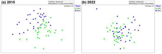 The nMDS 2-D ordination plots for both years showed overlap in the macrocrustacean assemblages between Limones and Bonanza (Figure 6), but to a much greater extent in 2022 (Figure 6b) than in 2015 (Figure 6a). The stress values (0.2) were relatively high, but 3-D ordination plots (not shown) with stress values of 0.14 confirmed the overlap between both reefs, especially in 2022. Indeed, ANOSIM yielded a lower value of R in 2022 (R = 0.136) than in 2015 (R = 0.256). Results of SIMPER (Table A2 in Appendix B) showed substantial similarity in the community composition of crustaceans among transects within each reef, ranging from 46.0% for Bonanza in 2015 to 49.7% on Limones in 2022, with four to eight species accounting for ~90% of similarity per reef each year. In 2015, the three most common species by reef were Calcinus tibicen, Mithraculus coryphe, and Domecia acanthophora on Limones (jointly accounting for 87% of the similarity), and M. coryphe, C. tibicen, and Neogonodactylus oerstedii on Bonanza (accounting for 78.5% of the similarity). In contrast, in 2022, the three most common species were the same on both reefs, M. coryphe, C. tibicen, and Pagurus brevidactylus, jointly accounting for 78% of the similarity on Limones and 69% of the similarity on Bonanza. Importantly, D. acanthophora, which was the third most important contributor to the similarity in Limones in 2015, with 8.3%, descended to sixth place in 2022, with only 2.1%. Between reefs, dissimilarity in crustacean composition was higher in 2015 (59%) than in 2022 (55%). The three main contributors to the dissimilarity between reefs were C. tibicen, M. coryphe, and D. acantophora in 2015 and M. coryphe, C. tibicen, and P. brevidactylus in 2022 (Table A2 in Appendix B).