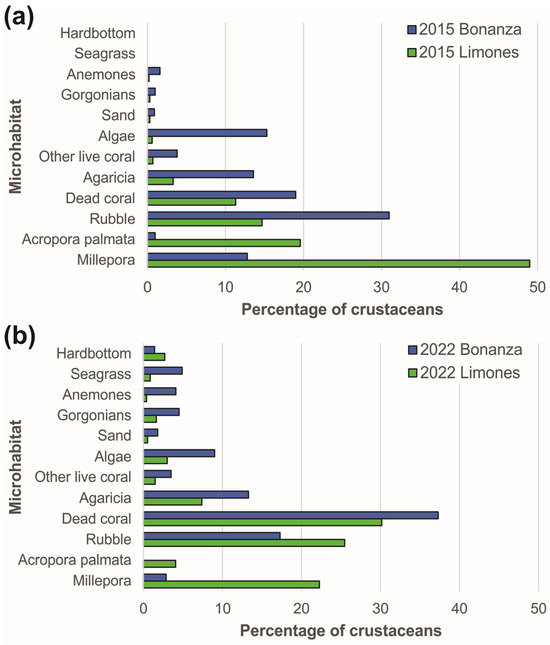 Percentages of crustaceans using different types of microhabitats on Limones reef (green columns) and Bonanza reef (blue columns) in (a) 2015 and (b) 2022.