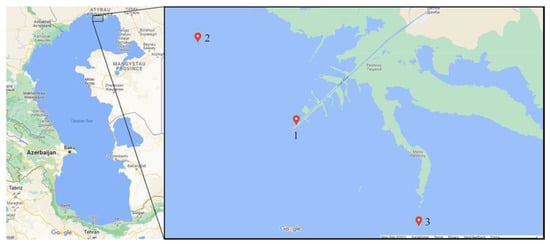 Water sampling sites in the Northern Caspian Sea. (1) Maritime shipping channel (Morskoy sudokhodnyy kanal)—46°50′05.9″ N 51°32′18.0″ E (46.834972, 51.538320), (2) Seashore of the Ural River (Vzmor’ye reki Ural)—46°55′59.2″ N 51°22′02.5″ E (46.933123, 51.367352), (3) Shalygi Bay Islands (Ostrova zaliva Shalygi)—46°42′52.7″ N 51°45′04.3″ E (46.714651, 51.751187). All studied samples from the Northern Caspian were taken on 21 May 2021.