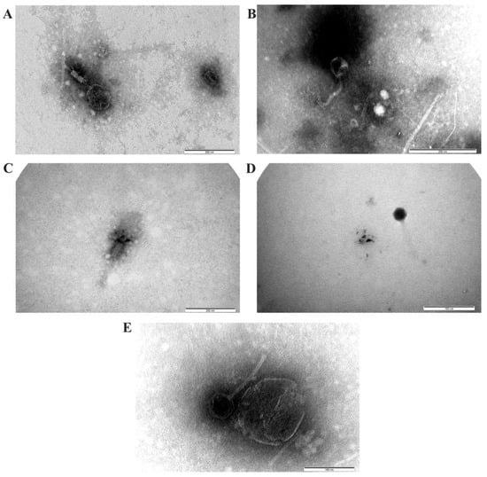 The morphology of viruses from aquatic samples observed with a transmission electron microscope revealed that viruses with typical head and tail structures, such as sipho-, myo- and podo viruses belonging to the Caudoviricetes class, were the most common (Figure 2).