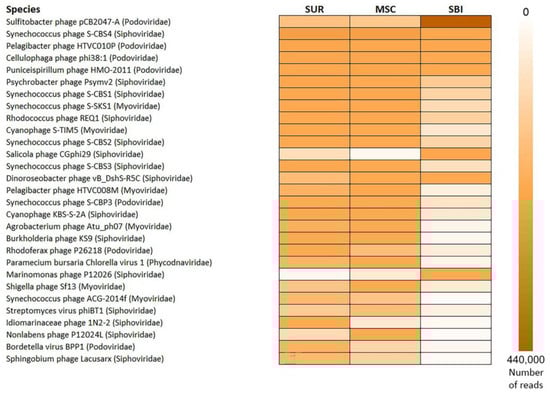 These results are similar to the findings of other investigations of marine viromes, such as Monterey Bay (65% of reads belong to tailed phages), the Indian Ocean (95.3%), the East China Sea, the Baltic Sea, the Southern Ocean near the Antarctic Peninsula and the Pacific Ocean (~80%), where this group of bacteriophages also predominated [23,24,25,69,70,71]. The predominance of dsDNA phages in marine viral communities is related both to the abundance of their hosts, the bacterial microflora and to their capacity for lysogenic and lytic replication [26]. It is known that viruses of the Caudoviricetes class infect a wide range of host bacteria, including Proteobacteria and Bacteroidetes types, whose representatives are a dominant and integral part of marine bacterial communities [68,72] and are directly involved in the degradation of biopolymers, phytoplankton lysis and processing of organic matter obtained after the death of living organisms [73]. In general, phages belonging to the Myoviridae and Siphoviridae groups were the most numerous in the SUR and MSC samples but not in the SBI sample where up to 55% of the viral reads belonged to the Podoviridae group. In addition, eukaryotic DNA viruses of the Lavidaviridae family, commonly known as virophages, whose reproduction depends on a co-infecting giant virus of the Mimiviridae family, were detected in all the investigated viromes. Reads related to virophages predominated in the MSC sample, as did those related to mimiviruses. Other studies of viromes [46,74,75,76] showed that virophages are widely spread throughout the world in a variety of environments, both marine and freshwater. In addition to virophages and tailed phages, viruses of seven other different families were quantitatively predominant in the MSC compared to the SUR and SBI samples. This diversity of viruses is most likely due to the high species diversity of the biota in the wetland ecosystem of the Ural River delta and along the Ural–Caspian navigation channel in the location where this sample was collected [77].
