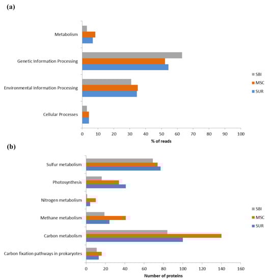 The KEGG pathway enrichment analysis revealed 259, 315 and 200 proteins of energy metabolism in the SUR, MSC and SBI samples, respectively. The detected proteins were involved in the metabolism of carbon, nitrogen, methane and sulfur, as well as in photosynthesis (Figure 4b). The greatest number of proteins detected pertained to carbon and sulfur metabolism, while nitrogen metabolism proteins were the least represented.