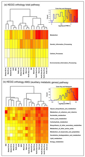 Clustering of virome datasets based on functional analysis. (a) The main functional groups of identified genes according to the KEGG database; (b) main functional metabolic categories of auxiliary genes (the number of reads of the functional groups is shown at log10 scale).