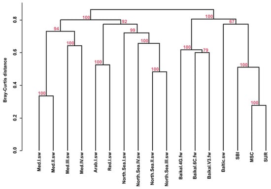 According to the hierarchical clustering, when comparing the taxonomic composition of viral communities of the North Caspian samples with other freshwater and marine samples, two main clusters were identified: the first and most numerous cluster included samples from the Mediterranean, Arabian, Red and North seas; the second cluster included samples from the North Caspian Sea, Baltic Sea and Lake Baikal (Figure 6). The Caspian Sea samples SUR and MSC were similar to each other but differed from SBI.