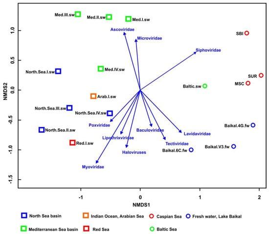 The differences in viral communities were investigated using nonmetric multidimensional scaling (NMDS) analysis (Figure 7). In general, according to the analysis, the gradient vector in the samples of the Caspian Sea, Baltic Sea and Lake Baikal shifted towards the dominance of siphoviruses. The samples from Lake Baikal (Baikal.6C.fw and Baikal.V3.fw) were more similar to each other and differed from Baikal.4G.fw by the predominance of the virotypes of the family Tectiviridae and the presence of baculoviruses. The sample from the Baltic Sea was placed into the main cluster with the samples from the Caspian Sea and Lake Baikal based on the taxonomic composition of the identified virotypes and families, but differed in their percentage. Virotypes related to siphoviruses also predominated in the samples from the Mediterranean Sea, but the Med.III.sw and Med.IV.sw samples differed from the Med.I.sw and Med.II.sw samples by the predominance of Haloviruses in them, the presence of representatives of Ascoviridae and the absence of viruses of the Microviridae family. In all the samples from the North Sea, the gradient vector shifted towards the predominance of myoviruses, but samples North.Sea.II.sw and North.Sea.III.sw differed in the presence of reads similar to poxviruses in them.
