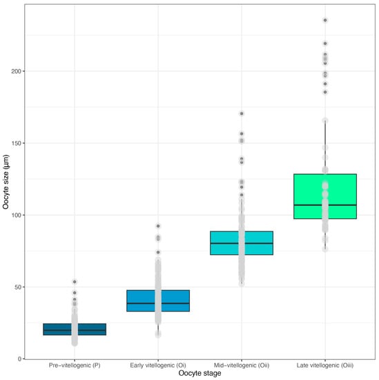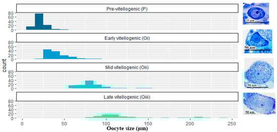 Four different oocyte states (Figure 2 and Figure 3) are defined for C. quadrumanus females according to their diameter and vitellogenic content, following the scale previously established by [45]: (1) pre-vitellogenic oocytes (p), round-shaped, average diameter of 21 ± 6.88 μm, without vitellogenic content and basophil cytoplasm; (2) early-vitellogenic oocytes (Oi) with some yolk granules, average diameter of 42 ± 13.5 µm; (3) mid-vitellogenic oocytes (Oii), average diameter of 84 ± 21.6 μm; (4) late-vitellogenic oocytes (Oiii), rich in yolk granules, average diameter of 122 ± 39.1 μm. The average oocyte size differs significantly among the stages (χ2 = 355.82; df = 3; p < 2.2 × 10−16), although their ranges overlap (Figure 2).