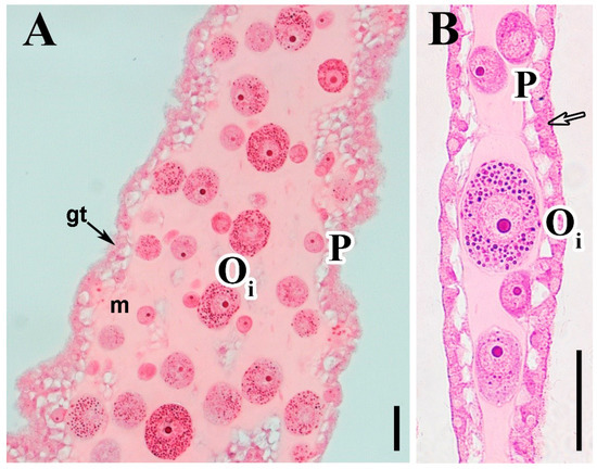 Gonadal section of the most immature studied female of Chiropsalmus quadrumanus (from Macaé, Rio de Janeiro). Stained with Gomori trichrome and hematoxylin (GT + H) and HE, respectively (A,B). Arrows show the columnar gonadal epithelium with basal vacuoles. Scale bars: 50 μm. gt—gastrodermal epithelium; m—mesoglea; Oi—early-vitellogenic oocyte; P = pre-vitellogenic oocyte.