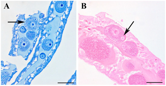 Gonads section of two different specimens of Chiropsalmus quadrumanus (from Macaé, Rio de Janeiro) stained with toluidine blue (A) and HE (B), respectively. Arrows show inclusions of unknown natures within the oocytes. Scale bars 50 μm.