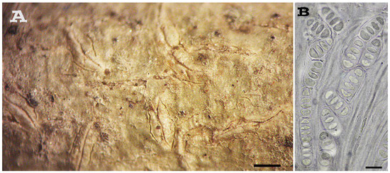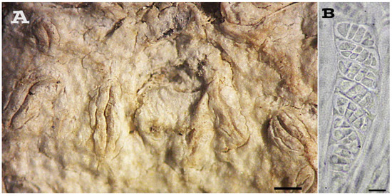 Fissurina elaiocarpoides (holotype). (A) Habitus, scale = 0.5 mm; (B) Ascospores, scale = 10 µm.