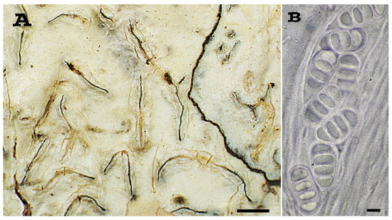 Fissurina nigrolabiata (holotype). (A) Habitus, scale = 1 mm; (B) Ascospores, scale = 5 µm.