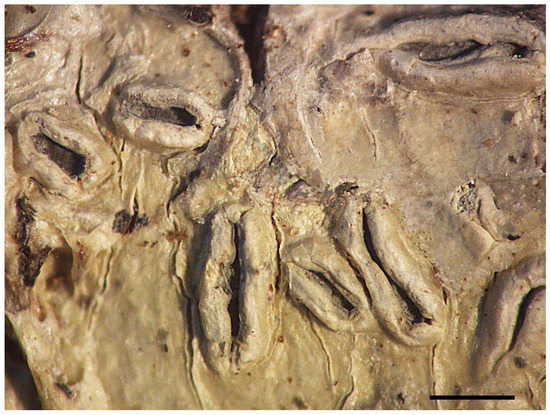 Notes: The name Fissurina dumastii was mentioned from Terceira [12], without any detail about its morphology. In the literature, descriptions are rather confusing. In [13], the species has immersed lirellae of 1–3 × 0.05–0.1 mm and ascospores of 18–20 × 8–10 µm, but in [9] sessile lirellae (especially visible in Figure 217) of 1–5 × 0.2–0.3 mm and ascospores of 11–18 × 5–6 µm. According to the rather depauperate type material from South America, the species is characterized by mostly immersed lirellae with thin labia (fissurinoid) and a somewhat gaping disc, apically spinulose paraphyses, and weakly amyloid ascospores [9]. As a consequence, much of the material identified with that name may not represent that species. Thus far, only two other species have been described with similar morphology but smooth paraphyses, F. amazonica M. Cáceres, Aptroot & Lücking from Brazil and F. coarctata Makhija & Adaw. from India, both with rather short lirellae [14,15]. We have several specimens that might belong to F. dumastii, but most of them are not well developed, with degenerated hymenia. Only one shows properly developed paraphyses and ascospores. It has lirellae 0.5–5 mm long, curved and often branched, a hymenium 90–110 µm high, and ascospores 12–15 × 8–9 µm in size. The original description [16] gives the type as “Habitat in America, ad corticem Cinchonae lanceolatae (Mutis.)”. This indicates that the type is from South America, collected by Mutis; Mutis lived in Colombia, so the type specimen is most probably from Colombia, not USA as indicated in the Index Fungorum.