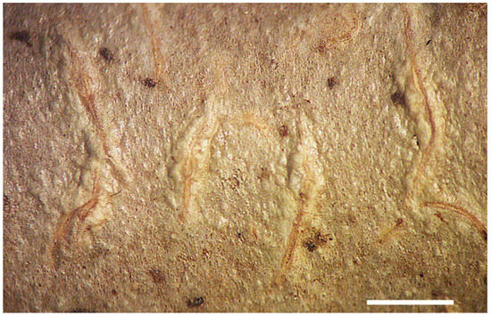 Notes: Fissurina consentanea is usually considered a synonym of F. triticea (Nyl.) Staiger [9]. Both agree in the prominent lirellae with thick labia (resembling Hemithecium), the three-septate, mid-sized ascopores (18–30 × 8–12 µm), and the stictic acid chemistry. However, neotropical material, represented by F. triticea, has exposed, yellowish-white labia and the ascospores are weakly amyloid, whereas paleotropical material, represented by F. consentanea, has the labia completely covered by thallus and the ascospores are non-amyloid. Specimens from Macaronesia fit the latter and hence should be identified as F. consentanea, replacing earlier reports under the names Graphis triticea Nyl. [4] and F. triticea [5,11].