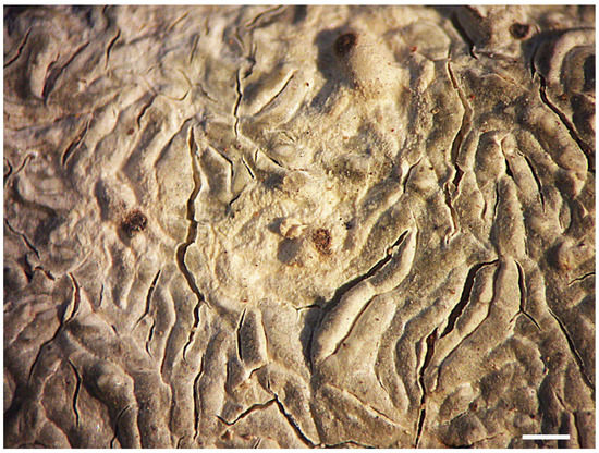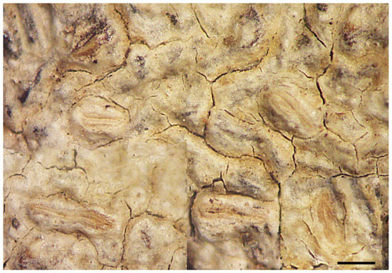 Notes: This new species belongs in a small group of taxa with muriform ascospores and thickened labia, making the impression of a species of the former genus Hemithecium. Although Fissurina elaiocarpoides may superficially be identified with commonly cited species such as F. incrustans Fée or F. instabilis (Nyl.) Nyl., both with muriform ascospores [9], close study shows that these and other superficially similar species have distinct, deviating morphologies and may differ in other details, apart from often different distributions. Thus, F. incrustans deviates in the olive-green thallus, the lirellae with thin labia and gaping disc, and the slightly smaller ascospores. Fissurina instabilis has an olive-green, uneven to verrucose thallus and whitish labia strongly contrasting with the thallus, and the ascospores are distinctly amyloid. Fissurina elaiocarpa (A.W. Archer) A.W. Archer, known from Australia, has an olive-green thallus with splitting cortex, strongly prominent lirellae with thin, orange labia, and broader, I+ distinctly amyloid ascospores [10]. The new species and F. aff. instabilis (see below) are the only species of Fissurina with muriform ascospores thus far known from Macaronesia.