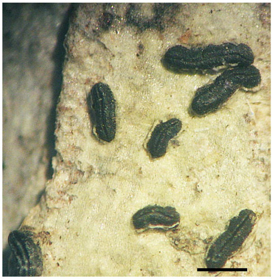 Notes: This is the first report from Macaronesia of this pantropical species [21]. The specimen deviates slightly because the striae on the excipulum are scarce and the central parts of the lirellae are not swollen and rather scarcely striate.