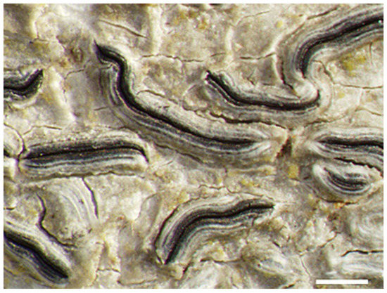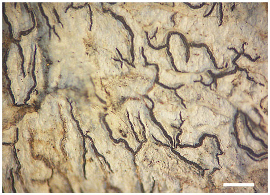 Notes: The Azores specimens fit Allographa verminosa as reported from Sintra [20]. The original description of Graphis verminosa Müll. Arg. [22] mentions lirellae 1–5 mm long, 0.5 mm wide, “subsimples et subrectae”, i.e., mostly unbranched and rather straight (confirmed by checking the lectotype: https://plants.jstor.org/stable/viewer/10.5555/al.ap.specimen.bm001106315 (accessed 2 December 2022); spores “8nae, 80–150 × 7–10 µm, 25–38-loc., vermiformes”. The Macaronesian (and mainland Portugal) material deviates because the ascospores are much shorter and slightly thicker and it might actually represent an undescribed taxon. The material here identified as Allographa verminosa has so far been confused with G. elegans. Both have striate lirellae and norstictic acid. The two species can be distinguished macroscopically by the emergent ascocarps with well-developed thalline margins in the first species, and the sessile ascoscarps without thalline margins in G. elegans. Microscopically A. verminosa has slender ascospores (9–12 µm wide) with lenticular locules and thin walls, and G. elegans has thicker ascospores (thick-walled, 15–17 µm wide) with rounded locules and thick walls. However, poorly developed specimens with poorly developed ascocarps and no ripe ascospores may be difficult to recognize.