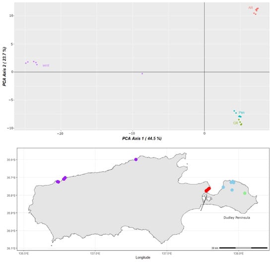 In the PCoA analysis (Figure 2), three major clusters were found that correspond to samples from the west of the island, samples from the American River, and samples from Baudin CP, Penneshaw and the Chapman River clustering together (Pen and CR). The single sample from Cape Cassini (purple) is separated from the other western samples by PCA Axis 1, which explains 44.5% of the variation in the data, and clearly separates the western and eastern sides of the island, matching to longitude as illustrated on the map insert. The second PCA Axis explains a further 23.7% of the variation, and separates the American River samples from the other eastern KI samples.