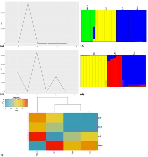 (a) STRUCTURE clustering of the M. rainbowi samples; plot of the change in the second order of likelihood, ΔK from the STRUCTURE results for each value of K (horizontal axis); (b) results of the STRUCTURE analysis for K = 3; east: Pen (Baudin CP and Penneshaw); CR (Chapman River); and AR (American River); west: Cape Forbin, Cape Cassini and Cape Torrens WPA. Each column represents a single individual’s estimated membership coefficients for each cluster; (c) STRUCTURE clustering of the eastern Kangaroo Island Moggridgea rainbowi samples; plot of the change in the second order of likelihood, ΔK from the STRUCTURE results; (d) results of the STRUCTURE analysis for K = 4; Pen (Baudin CP and Penneshaw); CR (Chapman River); and AR (American River). Each column represents a single individual’s estimated membership coefficients for each cluster. Colors represent distinct populations; (e) heatmap of allelic fixed differences between Moggridgea rainbowi populations: Chapman River/Penneshaw/Baudin CP (CR/Pen), American River (AR), and west; with IQ tree from the SNP data. Colors in the pairwise population comparisons reflect the number of fixed allelic differences among the populations based on the color key in the top left hand corner.