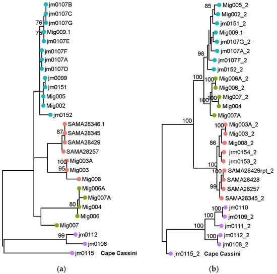 Phylogenetic analysis of the SNP dataset grouped the samples according to the four regions, giving a similar tree topology to the mitochondrial analysis with better support values, except for the position of the Cape Cassini sample (Figures S5 and S6).