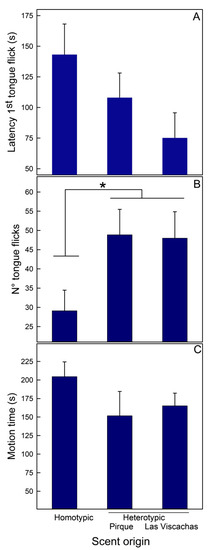 Liolaemus tenuis. Scent origin did not modulate the latency to the first tongue flick nor motion time (Table 1A; Figure 2A and 2C, respectively), but it did affect the number of tongue flicks; lizards explored the hetero- more than the homotypic scents and did not show differences in the exploration to both heterotypic scents (Figure 2B).