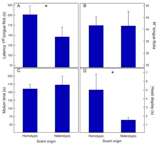 Liolaemus lemniscatus. Scent origin was the only factor that modulated some responses (Table 1B). First, males showed shorter latency to the first tongue flick when scents were from hetero- rather than homotypic rivals (Figure 3A). Second, males exhibited head displays for an extended period when they were exposed to homotypic scents (Figure 3D). None of the other variables, i.e., number of tongue flicks and motion time, were affected by scent origin (Figure 3B and 3C, respectively).