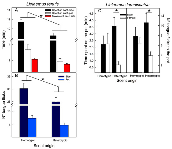 Mean (+SE) values of behaviors exhibited by lizards when tested for scent discrimination of potential mates from different origins, homo- and heterotypic. Liolaemus tenuis. Data from both populations and sexes were pooled: (A)—Time (min) spent on each side of the enclosure, on the pot with scents, and moving in each side of the enclosure. (B)—Number of tongue flicks displayed at each side of the enclosure and directed to the pot. (C)—Liolaemus lemniscatus. Data from both populations were pooled. Effect of the interaction between scent origin (homo- vs. heterotypic) and the sex of the tested individual upon the time (min) spent in the pot with scents from different origins (left) and the number of tongue flicks directed to those pots (right). * = p < 0.05.