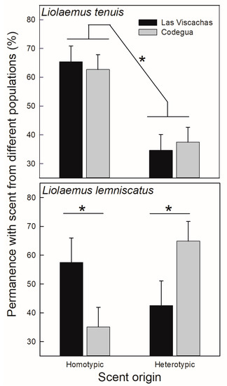 Individuals of L. tenuis, independent of their sex and population of origin, spent more time with homotypic scents (Table 3; Figure 5). In contrast, the scent preference in L. lemniscatus was influenced by the population of origin of the tested lizards; the lizards from Las Viscachas spent more time with homotypic scents than the Codegua population, which stayed for longer with heterotypic scents (Figure 5). The a posteriori tests, however, could not exclude that both populations behave similarly to pots with scents of different origin, although the Codegua population showed a tendency to prefer heterotypic scents (p = 0.052; Figure 5).