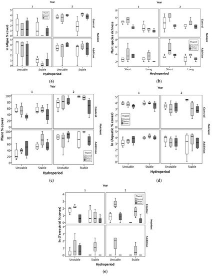Box plots of dependent variables ((a) algal cover, (b) plant species richness, (c) total plant cover, (d) aquatic plant cover, and (e) terrestrial plant cover) in response to hydro-regime, nutrient addition, and thatch addition over the two years of the study.