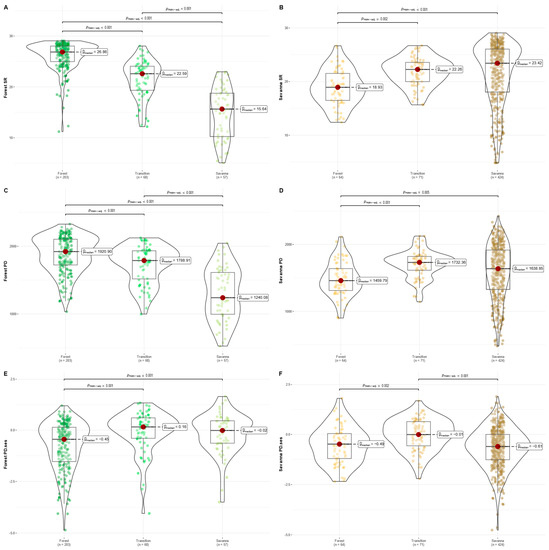 Violin plots of rarefied species richness (SR) for forest assemblages (A) and savanna assemblages (B), rarefied phylogenetic diversity (PD) for forest assemblages (C) and savanna assemblages (D), and rarefied standardised effect size of phylogenetic diversity (PDses) for forest assemblages (E) and savanna assemblages (F) across core forest, transition, and core savanna zones. The significant pairwise comparison of medians using the Dunn test with Holm correction are plotted as bars with p-values.