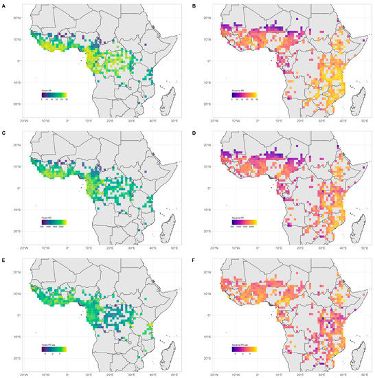 Maps of rarefied species richness (SR) for forest assemblages (A) and savanna assemblages (B), rarefied phylogenetic diversity (PD) for forest assemblages (C) and savanna assemblages (D), and rarefied standardised effect size of phylogenetic diversity (PDses) for forest assemblages (E) and savanna assemblages (F).