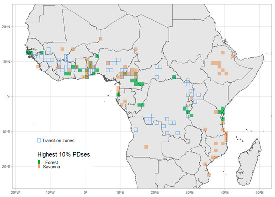 Map of highest 10% standardised effect size of phylogenetic diversity (PDses) for forest assemblages (green) and savanna assemblages (brown). Blue outlines represent transition zones.