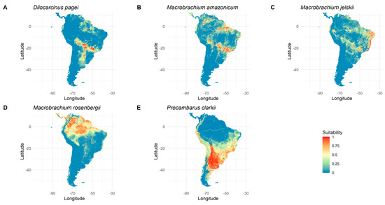 Suitability maps generated by the ensemble of the GLM, GBM, GAM, and RF algorithms for each species: (A) Dilocarcinus pagei, (B) Macrobrachium amazonicum, (C) Macrobrachium jelskii, (D) Macrobrachium rosenbergii, (E) Procambarus clarkii.