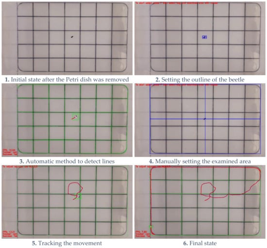 The current version of the BugTracker software was designed to automate the processing of this test in the best possible way, as this test is often used to evaluate exploratory behavior [,,]. In the basic videos, the software worked with a preset test environment, which consisted of an open box (364 × 230 mm) whose bottom was divided into 35 equal-sized squares []. The software was created in such a way that the grid lines could be added to the grids already placed at the bottom of the box, but this part can be omitted using the software, as it can create its grid structure during the session.