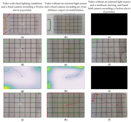 Performance of four tracking programs using the same video recordings with different lighting and camera stability conditions. Recorded movement paths: Tracktor (a–c); ToxTrac (d–f); Pathtrackr (g–i); BugTracker (j–l).