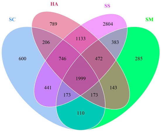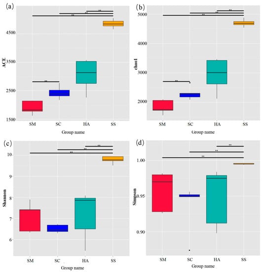 The diversity and richness indices of sediment and gut microbiota are shown in Figure 2. The ACE index and the Chao1 index were used to quantify the richness. The diversity of samples was calculated via the Shannon index and the Simpson index. The two indices of each part were double-checked to make our results more reliable. The method has been successfully performed in community diversity research [42,43]. The richness and diversity of microbiota in sediments were significantly higher than those in gut microbiota (p < 0.01). In the gut samples, the richness of microbial communities in the SM group was lower than that in the HA group (p < 0.05). In addition, there was no significant difference in gut microbiome diversity between the three sea cucumber species.