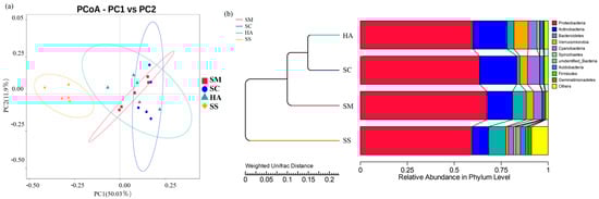 Beta diversity analysis can reflect the similarities and differences in the microbial communities between samples [44,45]. At the OTU level, two-dimensional principal coordinate analysis (PCoA) was performed for all samples based on the weighted Unifrac distance, with PC1 accounting for 50.03% of the total variation and PC2 for 11.97% (Figure 3a). As shown in the figure, the four groups of samples were clustered separately into two groups: all the sediment samples, and all the gut content samples from the three sea cucumber species. Anosim analysis is a nonparametric test used to test whether the differences between groups are significantly greater than the differences within groups, to determine whether the groups are meaningful [46]. The Anosim analysis showed that the intra-group differences were less than the inter-group differences (R > 0) (Table 2). There were significant differences between the groups (p < 0.05), except that there was no significant difference between the HA and SC groups.