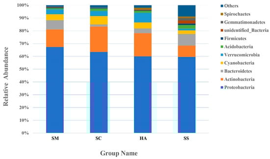 An average of 24.6 ± 2.74, 30.0 ± 2.08, and 34.8 ± 2.41 phyla were identified from the gut microbiota of S. monotuberculatus, S. chloronotus, and H. atra, respectively, and there were 54 phyla in the sediment microbial samples. The relative abundance of the 10 most abundant phyla in the sediment and the gut of the three sea cucumber species are shown in Figure 4. The dominant phyla in the S. monotuberculatus gut microbiota were Proteobacteria, Actinobacteria, and Bacteroidetes, with relative abundances of 67.37 ± 7.04%, 13.70 ± 1.47%, and 7.32 ± 6.10%, respectively, and the dominant phyla of gut microbes in S. chloronotus were Proteobacteria, Actinobacteria, and Cyanobacteria, with relative abundances of 63.48 ± 10.90%, 19.85 ± 14.04%, and 6.48 ± 3.28%, respectively. The dominant phyla of the H. atra gut microbes were Proteobacteria, Actinobacteria, and Verrucomicrobia, with relative abundances of 60.00 ± 5.75%, 18.19 ± 6.42%, and 7.50% ± 0.60%, respectively. The dominant microbial phyla of the sediment group were Proteobacteria, Bacteroidetes, and Actinobacteria, with relative abundances of 59.60 ± 5.22%, 9.15 ± 6.42%, and 8.79 ± 3.36%, respectively. Proteobacteria was the predominant phylum in all samples, and there was no significant difference in the relative abundance among all groups. Actinobacteria was also a dominant phylum of all samples, with the relative abundance of SM sample groups being lower than that of the other three groups (p < 0.05, q < 0.05).