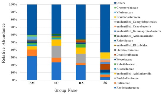 The dominant families in the gut microbiota of SM, SC, and HA were sequences related to Rhodobacteraceae (31.76 ± 13.77%) and Halieaceae (8.66 ± 3.23%), Rhodobacteraceae (23.49 ± 6.16%) and Burkholderiaceae (15.91 ± 11.15%), and Rhodobacteraceae (19.67 ± 5.68%) and Burkholderiaceae (12.03 ± 11.82%), respectively (Figure 5). The top-two dominant families in sediment samples were Desulfobacteraceae (8.25 ± 2.63%) and Desulfobulbacea (7.46 ± 2.36%). Rhodobacteraceae was the most abundant family in all the gut content samples and was higher than the relative abundance in the sediment (3.88 ± 1.52%, p < 0.05, q < 0.05). The relative abundance of Desulfobulbaceae and Desulfobacteraceae in SS was significantly higher than that in SM, SC, and HA (p < 0.01, q < 0.05).