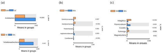 Based on the t-test, it was possible to analyze the differences in the gut microbiota between the three species of sea cucumber. At the phylum level, the number of phyla with differential gut microflora of the three sea cucumber species was low and not statistically significant (Figure 7a). Specifically, the only significant differences in the phylum were Acidobacteria (p < 0.05, q < 0.05) between SM and SC groups, and Schekmanbacteria (p < 0.05, q < 0.05) between SC and HA groups. The main differences in gut microbiota among the three species were seen at the family level (Figure 7b) and the genus level (Figure 7c). At the family level, there were five families with differences between SM and HA (p < 0.05, q < 0.05). At the genus level, five genera were different between SM and HA (p < 0.05, q < 0.05).