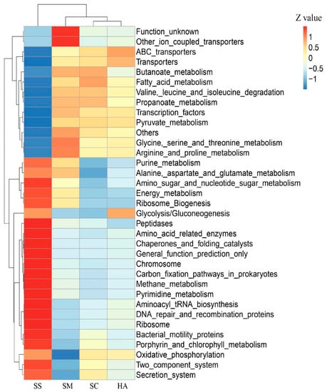 Based on the KEGG pathway database, a total of 328 level-3 pathways were annotated in the 4 groups of samples. The t-test showed that there were significant differences in the level-3 pathways of gut microbiota and sediment microbiota among the 3 sea cucumber species, showing 178, 213, and 132 highly significantly different (p < 0.001) pathways between SS and SM, SS and SC, and SS and HA, respectively. There were 12, 15, and 8 significantly different pathways between SM and SC, SM and HA, and SC and HA, respectively (p < 0.01). Cluster analysis was performed for the top 34 level-3 metabolic pathways in relative abundance (Figure 8). The four groups of samples were divided into two major groups, in which the SS group was a group, and the gut sample groups were clustered into a group, indicating that the functional similarity between the gut microflora of the three sea cucumber species was found to be closer than that of the sediment microflora. The main pathways in the gut include transporters, ABC transporters, transcription factors, arginine and proline metabolism, butanoate metabolism, propanoate metabolism, pyruvate metabolism, valine, leucine, and isoleucine degradation, glycine, serine, and threonine metabolism, and fatty acid metabolism (Figure 8). The PCA revealed that the function of gut microflora in sea cucumbers was markedly different from that of sediment microflora. In addition, the functions of the gut microbiota in the three species of sea cucumber were clustered together and did not completely overlap with each other (Figure 9).