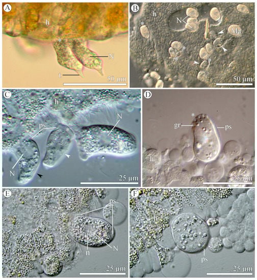 The detailed morphology of E. duboscqi trophozoites and gamonts was described in 2015 by Valigurová et al. using modern microscopic methods []. Here, we supplement this description with statistical and morphometric data on the White Sea material to further refine the diagnosis of the species (Table 1, Taxonomic Summary; Figures S1 and S2).
