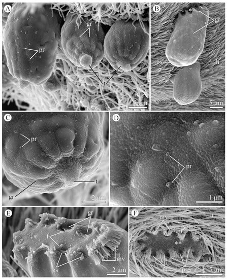 Fine structure of Eleutheroschizon planoratum sp. nov. Scanning electron microscopy. (A,B) Parasites attached to the host intestinal epithelium. (C) Posterior end of a parasite enveloped by the parasitophorous sac. (D) Higher magnification of pores visible in the parasitophorous sac (C). (E) Attachment site of a mechanically dislodged parasite. (F) Crater left on the host tissue after detachment of a parasite. Abbreviations: *, attachment base of the parasite; **, crater on the host intestinal epithelium, corresponding to the parasite attachment base; cl, cilia of the host intestinal epithelium; f, fascicle of filaments of the parasite attachment base; fh, hole for a fascicle of filaments; gr, groove on the parasite surface; h, host intestinal epithelium; mv, microvilli of the host enterocyte; pr, pores; ps, parasitophorous sac; t, “tail”—caudal appendage of the parasitophorous sac.