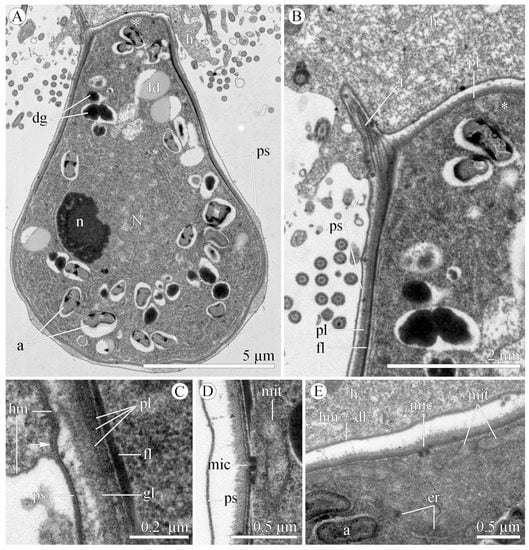 In addition to previous light-microscopic studies on E. duboscqi [,], the endogenous (trophozoite and gamont) stages of this parasite were found in the intestines of S. armiger polychaetes from the White Sea littoral and studied using modern light, confocal and electron microscopy []. This study showed that E. duboscqi develops in the parasitophorous sac. The parasitophorous sac, previously described for cryptosporidians [], is an epicellular structure (niche) formed by the host cell, enveloping the entire parasite. It consists of two continuous host plasma membranes on the outer and inner sides and a thin layer of host cell cytoplasm between them. The unmodified and modified parts of the host cell are separated by a dense band of microfilaments. The parasitophorous sac forms a caudal appendage (“tail”) over the posterior end of the parasite and has pores on its surface. Parasites have a morphologically pronounced attachment apparatus. It consists of outgrowths (lobes) arranged in one or two circles around the convex center of the attachment surface and a peripheral ring of fascicles of long filaments alternating with short hook-shaped filaments. The parasite cortex is a three-membrane pellicle with a well-developed dense fibrous glycocalyx and micropores characteristic of apicomplexans. Outside the attachment base, the parasite surface is organized into weakly expressed broad folds with shallow grooves between them. The pellicle between the grooves is lined by longitudinal ribbons of subpellicular filaments ending near the attachment fascicles of filaments. The micropores are located at the bottom of the grooves as well as on the attachment surface. The parasites do not form a direct contact with the host cell. The internal space of the parasitophorous sac is mostly translucent and continuous around the entire parasite, including the attachment site. The host-derived parasitophorous sac provides the parasites with permanent protection in the potentially unfriendly environment of the host intestine. These data interconnect the parasitophorous niche of E. duboscqi with that of Cryptosporidium [,,].