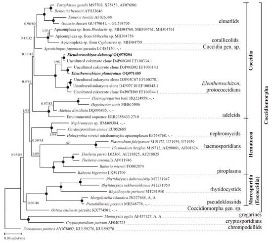 Bayesian tree of coccidiomorphs inferred from the dataset of 37 concatenated SSU, 5.8S, and LSU rDNA sequences (4527 bp) under the GTR+Γ+I model with 4 rate categories. Numbers at branches indicate Bayesian posterior probabilities (numerator) and ML bootstrap percentage (denominator). Black dots on the branches indicate Bayesian posterior probabilities and bootstrap percentages of 1.0 and 100%, respectively. The newly obtained sequences of Eleutheroschizon duboscqi and E. planoratum are in bold. The names of major coccidiomorph lineages correspond to Janouškovec et al., 2019, Mathur et al., 2020, and Miroliubova et al., 2020 [,,].
