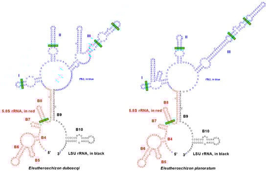 The predicted secondary structures of ITS2 molecules of Eleutheroschizon spp. were manually generated and tested via MFOLD in the temperature of 5–37 °C under default parameters, except for the suboptimality percentage parameter which was chosen as 15 []. To prove that E. duboscqi and E. planoratum are different species, compensatory base changes (CBCs) in secondary ITS2 molecule structures were searched [,,,].